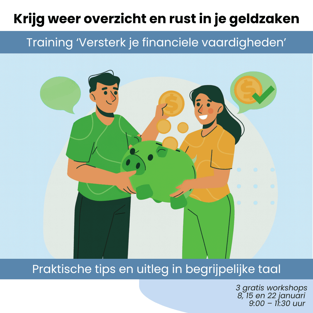 Brieven van de gemeente, online formulieren of het ordenen van je administratie kunnen lastig zijn. Rekeningen blijven liggen en dat geeft stress. In deze training krijg je duidelijke uitleg en praktische tips die je meteen kunt gebruiken. Je leert slimmer met je geld omgaan, overzicht houden en veilig online werken. We bespreken ook wat je moet regelen bij ingrijpende gebeurtenissen, zoals een kind dat 18 wordt of als je inkomen verandert. Zonder dure woorden, maar in taal die jij begrijpt.